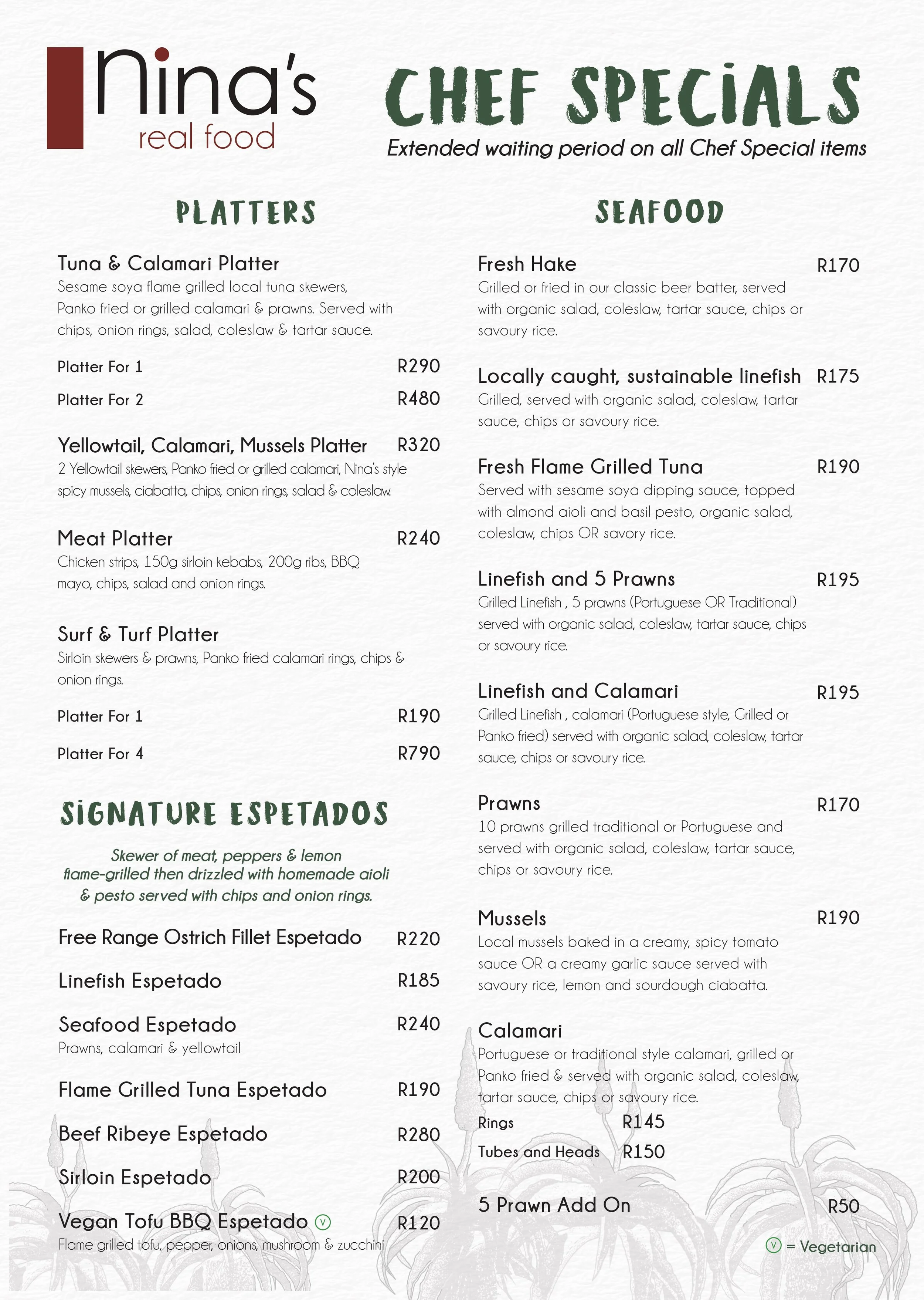 Nina's Real Food was opened by us, the Smith Family, in Jeffreys Bay in 2010. Our successful take-away in East London was established in 1989. We relocated to Jeffreys Bay as we are passionate about the town, lifestyle, people and obviously the surf! Nina's is named after our first born daughter who passed away very young. We have since been blessed with three beautiful surfer girls who are all hands on in the family business when not competing or just surfing!